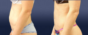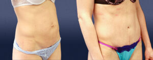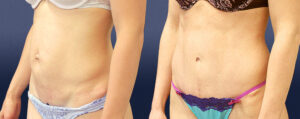 She is 5’2” tall and weighs 115 pounds. She underwent an abdominoplasty with rectus muscle plication and a small amount of contouring liposuction. There is a vertical scar visible above the underwear line from her old bellybutton opening.