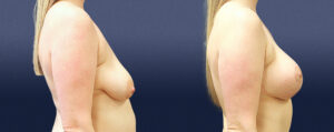 She underwent a sub-muscular breast augmentation using smooth round gel implants, with a vertical mastopexy and balancing reduction. The implants used were Mentor, High Profile, smooth round silicone gel, 450 cc in size.
