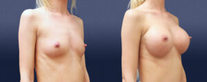 She is 5’5” tall and weighs 105 pounds. She underwent a dual plane, breast augmentation through an IMF incision using smooth round gel implants.