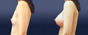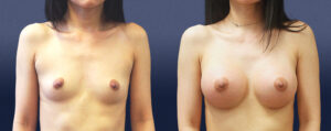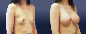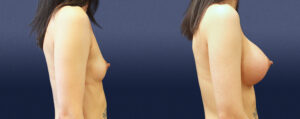 She is 5’3” tall and weighs 117 pounds. She underwent a duel plane breast augmentation through an IMF incision using smooth, round silicone gel implants. The implant are Natrelle, Inspira SSX 445 cc on the right, and SSX 420 cc on the left to account for some chest wall asymmetry.