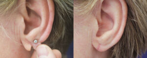This lovely 57-year-old says she used to wear heavy earrings and eventually the left side pulled through. This was repaired using local flaps to minimize the post revision notching.