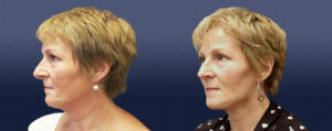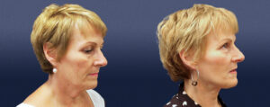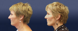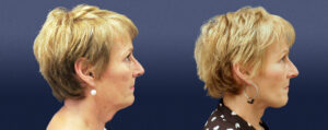She underwent a full neck lift with submental liposuction, direct subplatysmal fat excession and platysmal plication. At the same time, she also had a lower facelift.