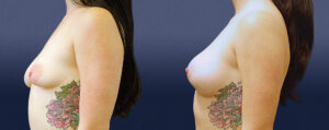 On the right side, she underwent a small vertical breast reduction with augmentation in the submuscular plane. On the left side, she had tuberous breast deformity correction with a circumareolar mastopexy and radial scoring, followed by submuscular augmentation.