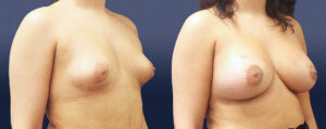 She is 5’6” and weighs 150 pounds and underwent bilateral breast augmentation with lower pole radial scoring for expansion to correct the tuberous breast deformity. The implants are Natrelle, smooth round silicone gel, SRF 450 cc in size.